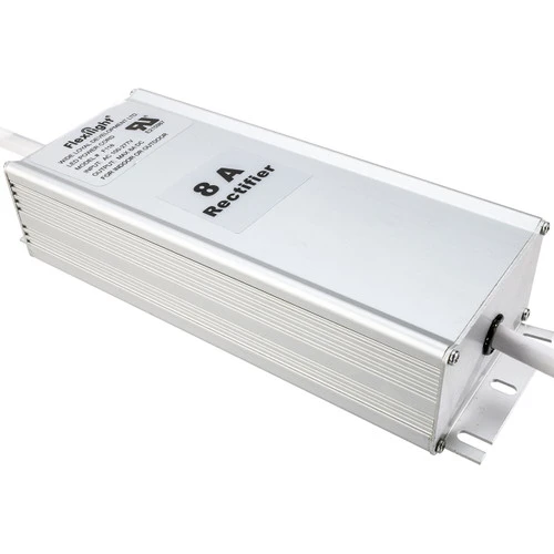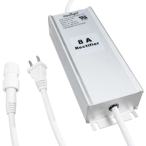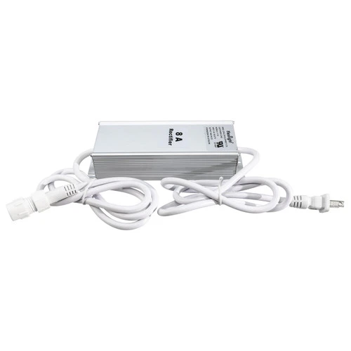 Use this high output rectified power supply to power multiple spools of 1/2 inch LED rope lights. Run much more than a normal LED power cord this 8 amp power supply can power up to a combined length of up to 600 feet – four 150 foot spools of LED rope lights. This indoor power supply plugs into a regular wall outlet and connects to the LED rope light using the included 1/2 inch compression power connector.