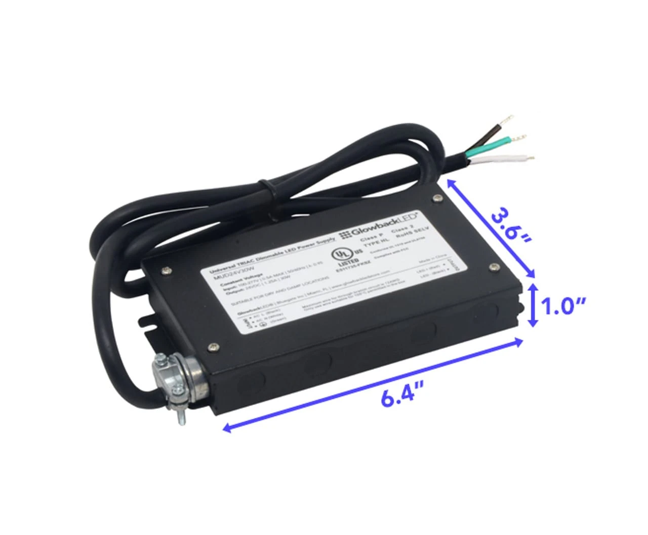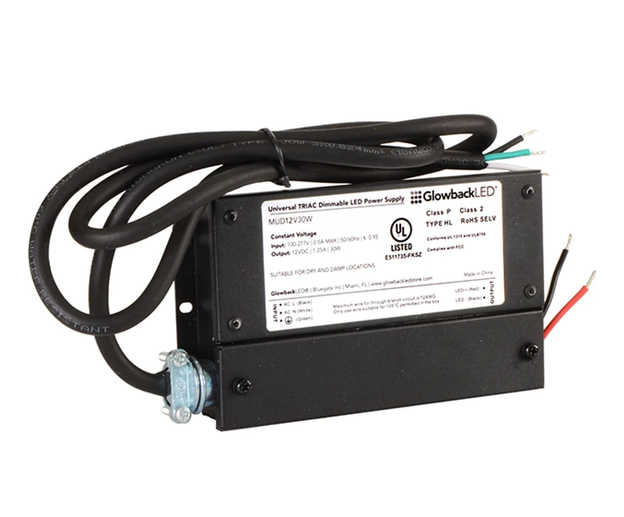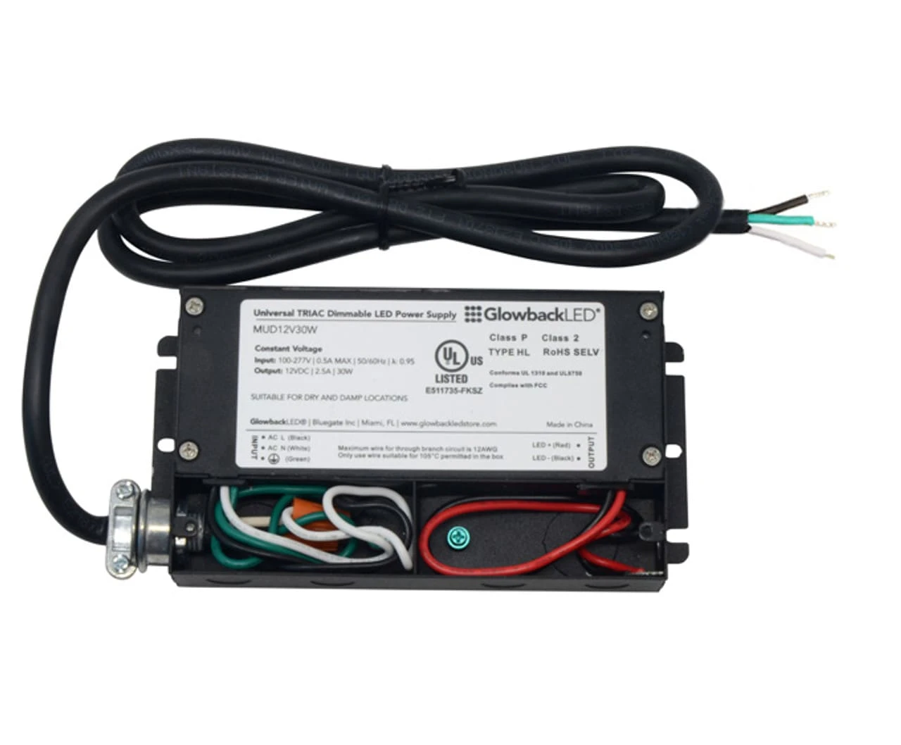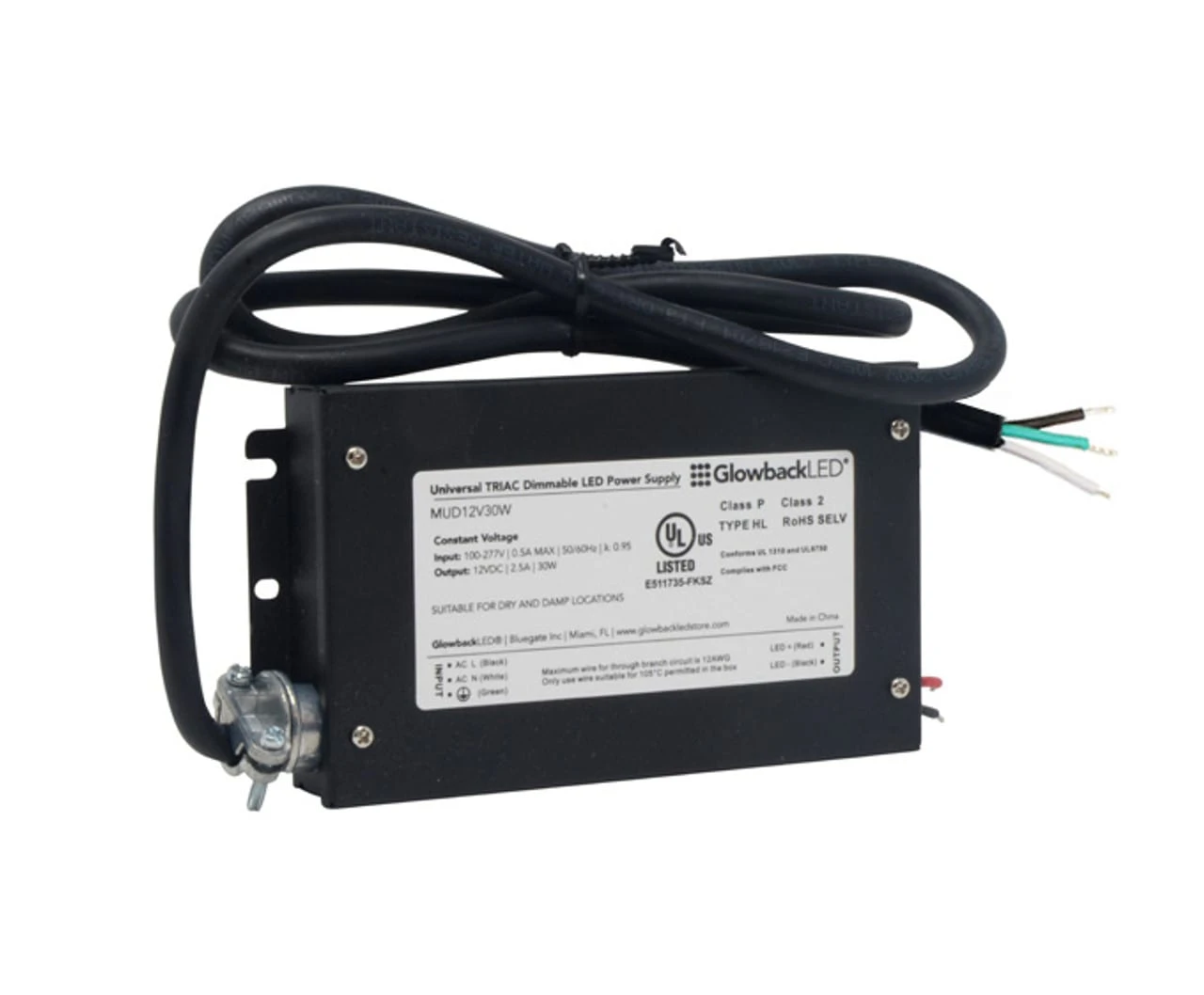 Manufactured exclusively for GlowbackLED, Our new MUD12V30W is a 12V 30W Dimmable LED Power Supply suitable for a wide range of LED strip and linear lighting products. Our MUD12V30W can be used with any phase control dimmers (Forward Phase (Triac/MLV) and Reverse Phase (ELV). Unlike our older dimmable LED power supplies our MUD12V30W outputs consistent, flicker-free lighting which can be smoothly dimmed down to 1%. Our MUD12V30W conveniently comes with a 3ft power cord and (US) plug for quick and easy LED strip lighting installations! This Dimmable LED Driver features an integrated wiring compartment, allowing one to make clean connections inside of the power-supply with no need for external junction boxes. The slim and compact design makes our MUD12V30W an excellent solution for under-cabinet LED lighting. Last, but certainly not least, our MUD12V30W is UL-Listed and ready for use on any commercial LED lighting project.