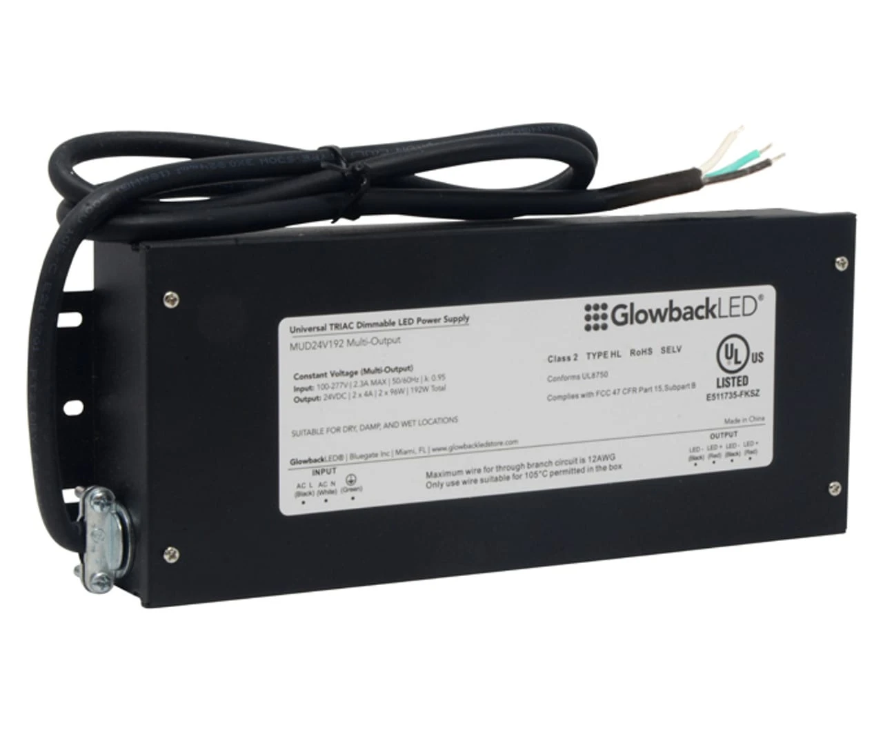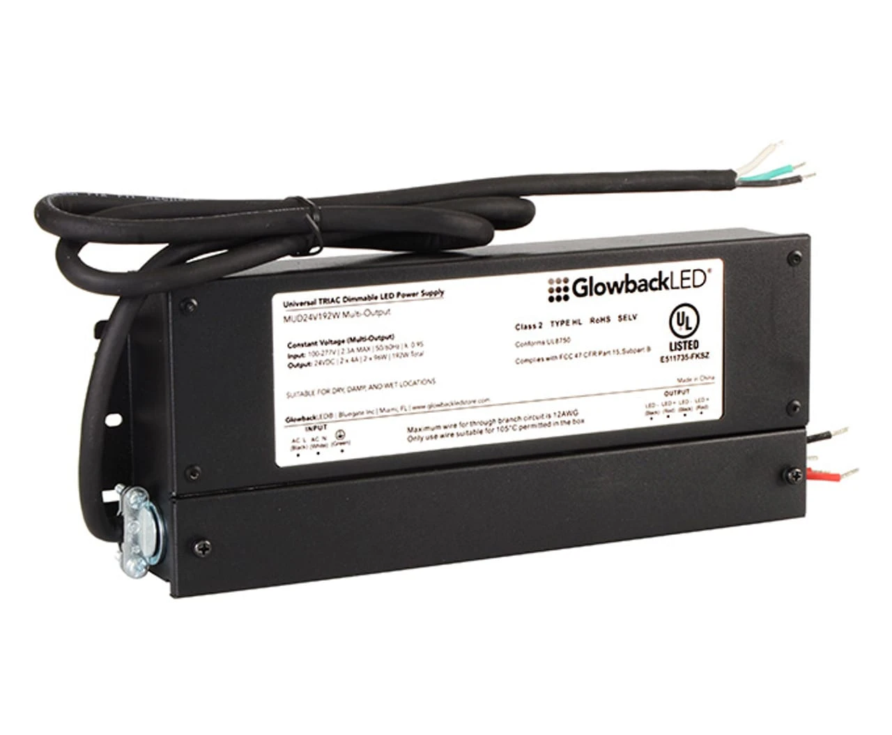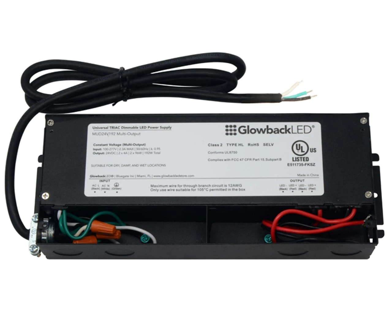 Manufactured exclusively for GlowbackLED, Our new MUD24V192W is a 24V Dimmable LED Power Supply with 2x 96W power outputs, suitable for powering a wide range of LED strip and linear lighting products. Our MUD24V192W can be used with any phase control dimmers (Forward Phase (Triac/MLV) and Reverse Phase (ELV). Unlike our older dimmable LED power supplies our MUD24V192W outputs consistent, flicker-free lighting which can be smoothly dimmed down to 1%. Our MUD24V192W conveniently comes with a 3ft power cord and (US) plug for quick and easy LED strip lighting installations! This Dimmable LED Driver features an integrated wiring compartment, allowing one to make clean connections inside of the power-supply with no need for external junction boxes. With 2x 96W outputs, you get 2 96W power supplies in one, while still retaining the UL-Listing and Class-2 Rating. The slim and compact design makes our MUD24V192W an excellent solution for under-cabinet LED lighting. Last, but certainly not least, our MUD24V192W is UL-Listed and ready for use on any commercial LED lighting project.