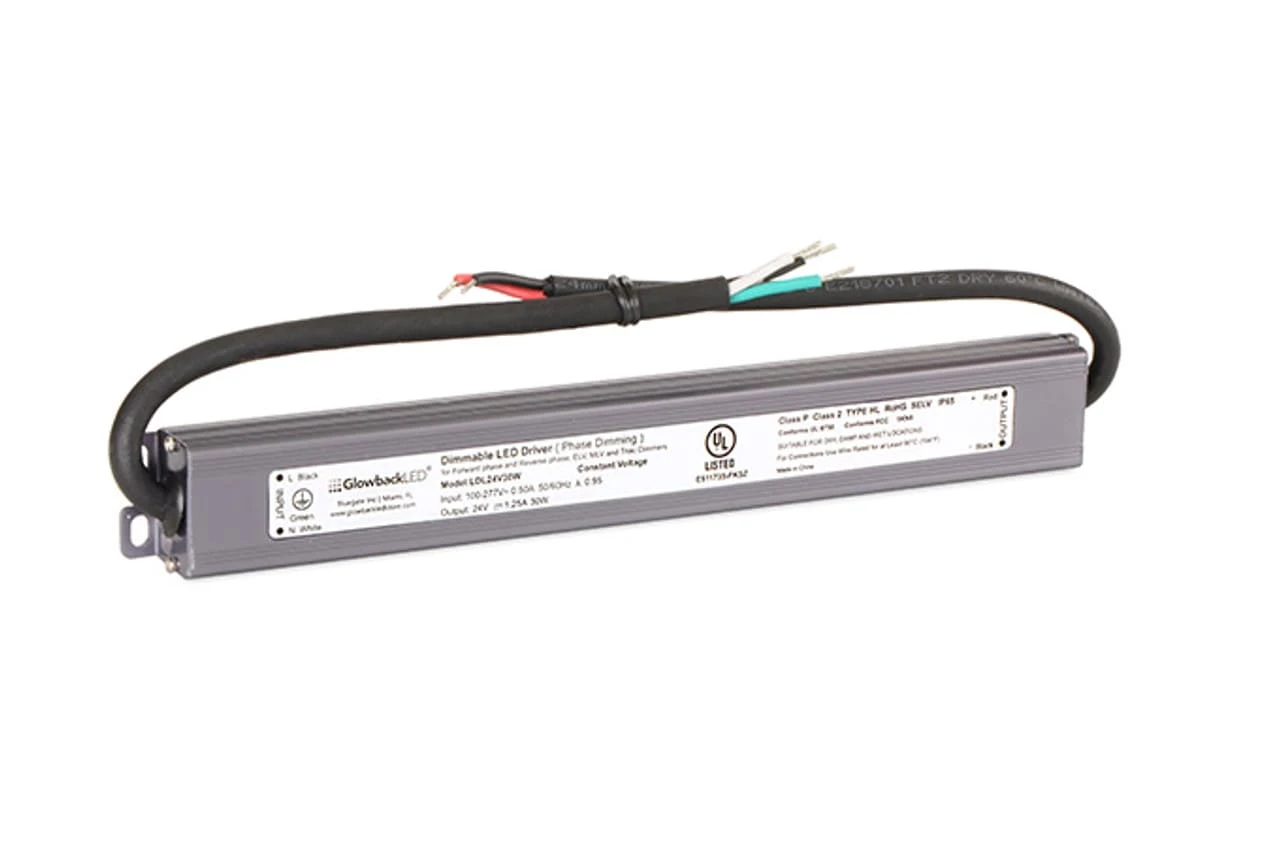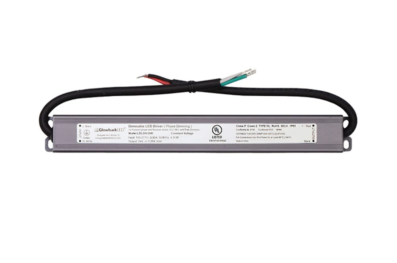Manufactured exclusively for GlowbackLED, Our new LDL24V30W is a Slim Waterproof Linear 24V 30W Dimmable IP65 LED Power Supply suitable for a wide range of LED strip and linear lighting products. Our LDL24V30W can be used with any phase control dimmers (Forward Phase (Triac/MLV) and Reverse Phase (ELV). Unlike our older dimmable LED power supplies our LDL24V30W outputs consistent, flicker-free lighting which can be smoothly dimmed down to 1%. Our LDL24V30W conveniently comes with a 3ft power cord and (US) plug for quick and easy LED strip lighting installations! This Dimmable LED Driver features an integrated wiring compartment, allowing one to make clean connections inside of the power-supply with no need for external junction boxes. This slim, linear design makes our LDL24V30W an excellent solution for powering our and fits inside of our , which has a dedicated slot for housing an LED power supply. The slim linear form factor and wet-rated IP-65 design makes it a great compact solution for wet-rated LED strip lighting installations with limited space.