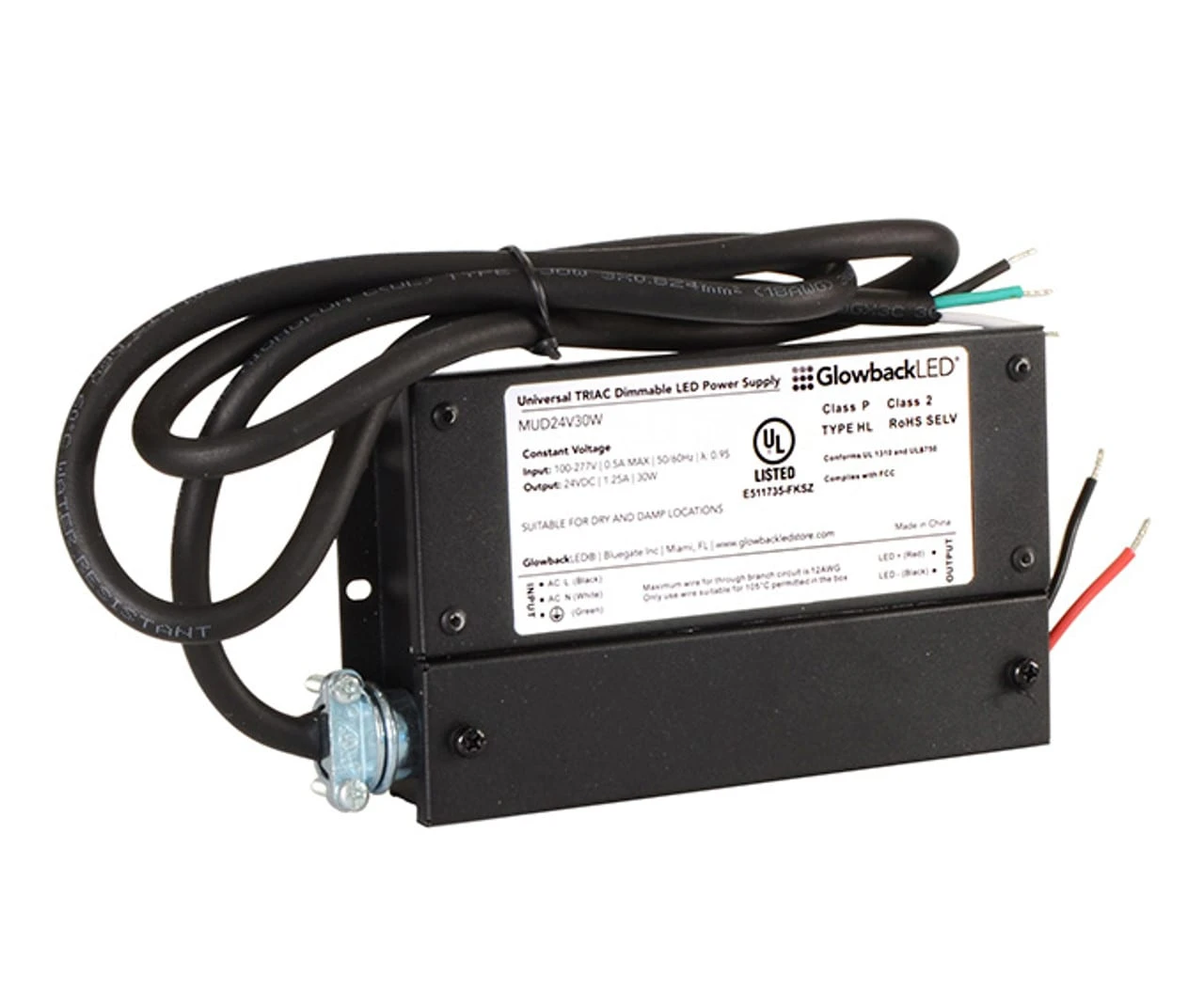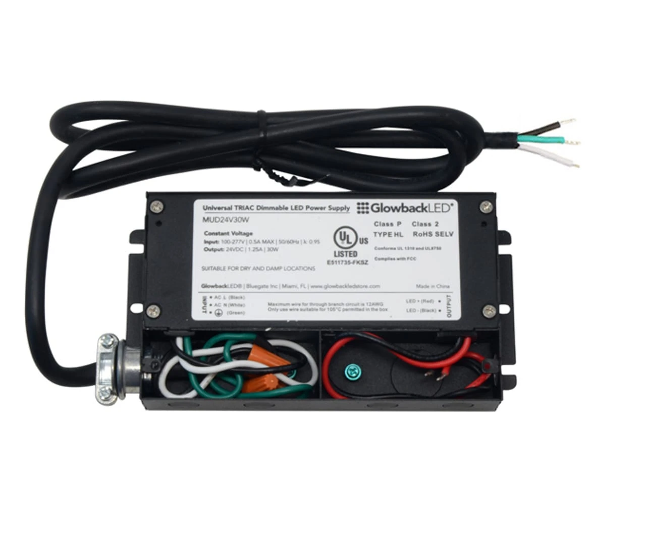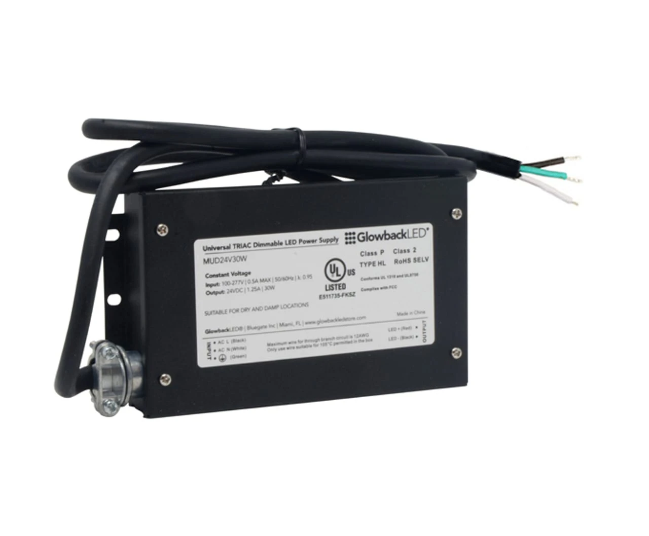 Manufactured exclusively for GlowbackLED, Our new MUD24V30W is a 24V 30W Dimmable LED Power Supply suitable for a wide range of LED strip and linear lighting products. Our MUD24V30W can be used with any phase control dimmers (Forward Phase (Triac/MLV) and Reverse Phase (ELV). Unlike our older dimmable LED power supplies our MUD24V30W outputs consistent, flicker-free lighting which can be smoothly dimmed down to 1%. Our MUD24V30W conveniently comes with a 3ft power cord and (US) plug for quick and easy LED strip lighting installations! This Dimmable LED Driver features an integrated wiring compartment, allowing one to make clean connections inside of the power-supply with no need for external junction boxes. The slim and compact design makes our MUD24V30W an excellent solution for under-cabinet LED lighting. Last, but certainly not least, our MUD24V30W is UL-Listed and ready for use on any commercial LED lighting project.
