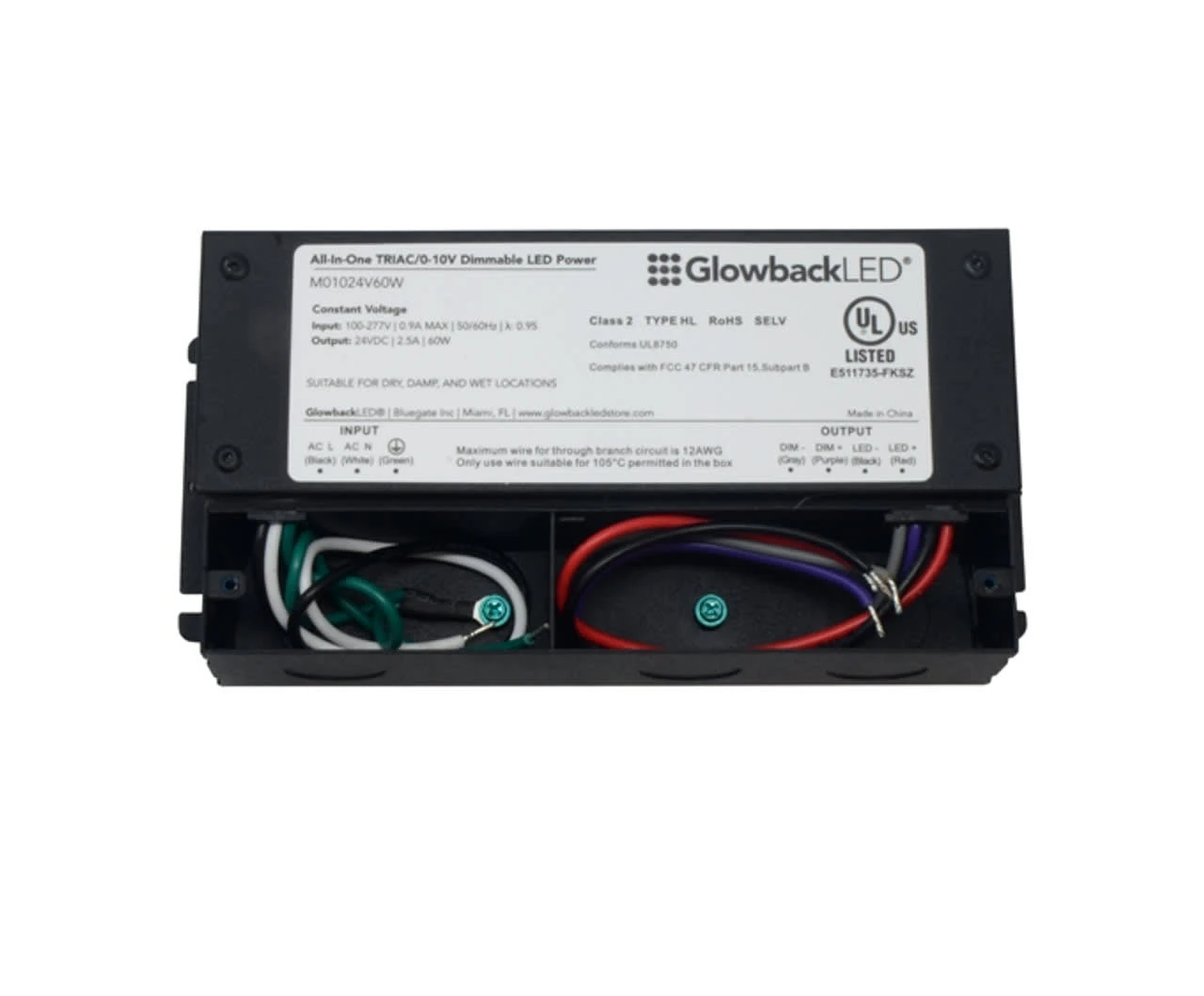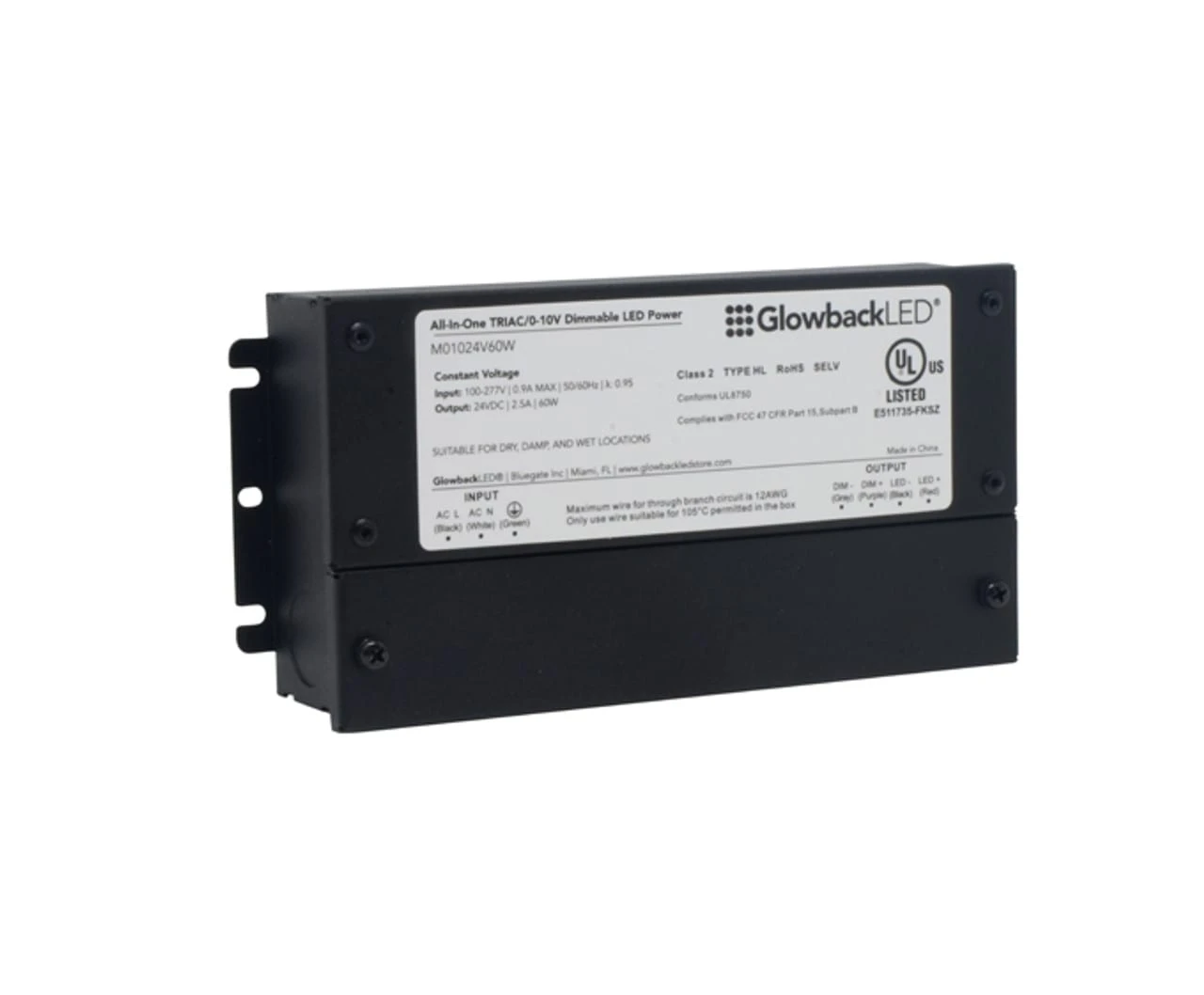 Manufactured exclusively for GlowbackLED, Our new M01024V60W Universally Dimmable Driver is a 24V 60W Dimmable LED Power Supply suitable for a wide range of LED strip and linear lighting products. Our M01024V60W can be used with ANY type of dimmer from 0-10V to phase dimmers. Unlike our older dimmable LED power supplies, our M01024V60W driver delivers consistent, flicker-free lighting which can be smoothly dimmed down to 1%. Our M01024V60W driver conveniently comes with a 3ft power cord and (US) plug for quick and easy LED strip lighting installations! This Dimmable LED Driver features an integrated wiring compartment, allowing one to make clean connections inside of the power-supply with no need for external junction boxes. The slim and compact design makes our M01024V60W an excellent solution for under-cabinet LED lighting. Last, but certainly not least, our M01024V60W is UL-Listed and ready for use on any commercial LED lighting project.