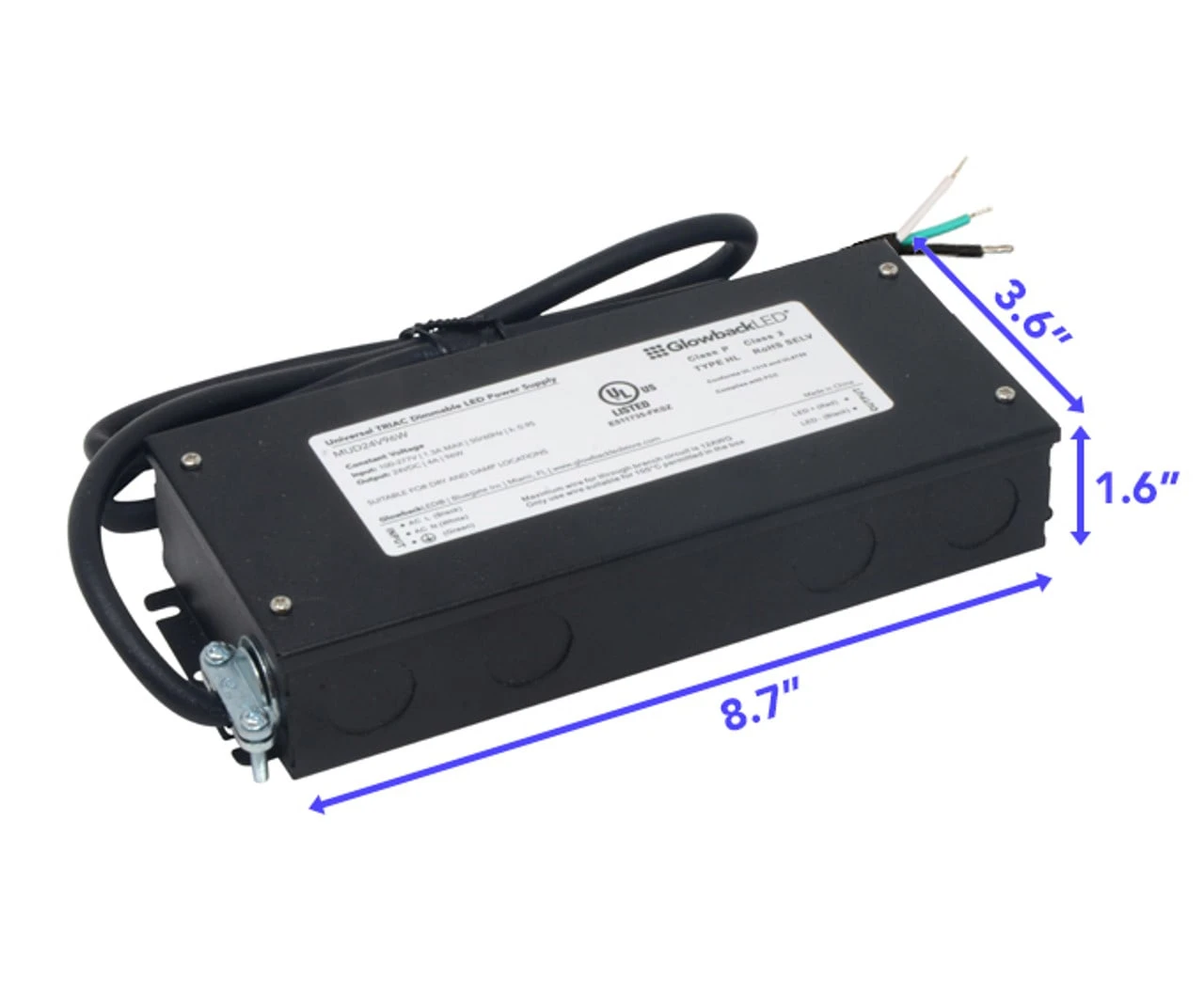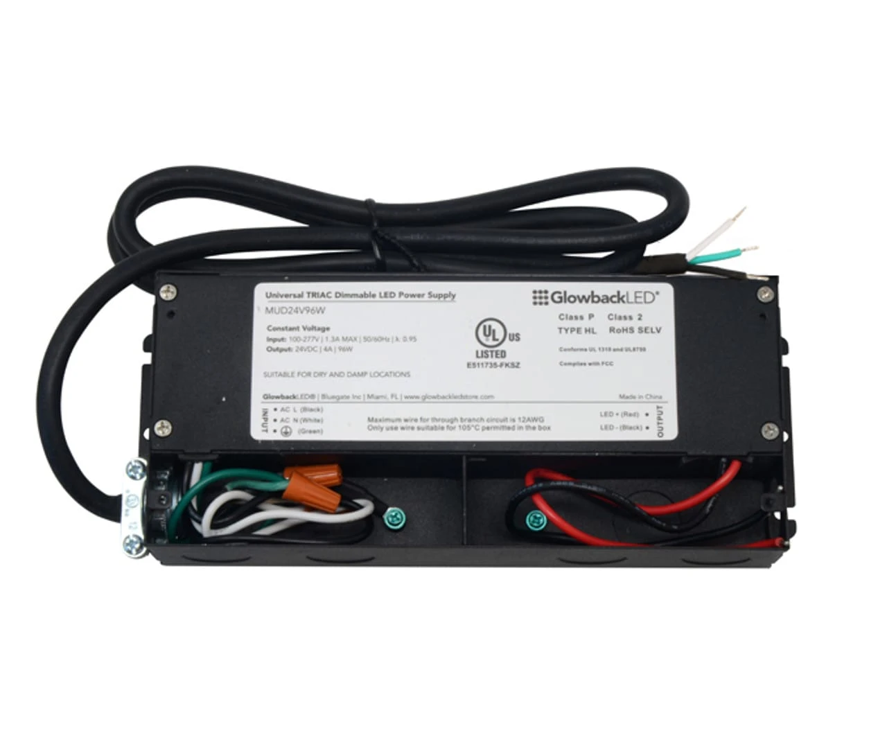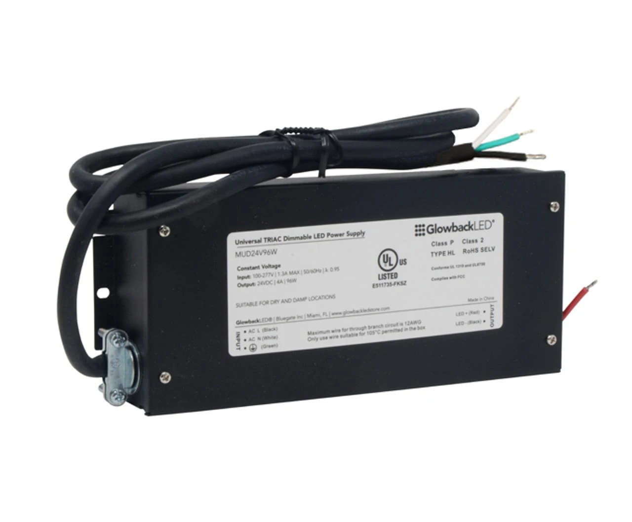 Manufactured exclusively for GlowbackLED, Our new MUD24V96W is a 24V 96W Dimmable LED Power Supply suitable for a wide range of LED strip and linear lighting products. Our MUD24V96W can be used with any phase control dimmers (Forward Phase (Triac/MLV) and Reverse Phase (ELV). Unlike our older dimmable LED power supplies our MUD24V96W outputs consistent, flicker-free lighting which can be smoothly dimmed down to 1%. Our MUD24V96W conveniently comes with a 3ft power cord and (US) plug for quick and easy LED strip lighting installations! This Dimmable LED Driver features an integrated wiring compartment, allowing one to make clean connections inside of the power-supply with no need for external junction boxes. The slim and compact design makes our MUD24V96W an excellent solution for under-cabinet LED lighting. Last, but certainly not least, our MUD24V96W is UL-Listed and ready for use on any commercial LED lighting project.