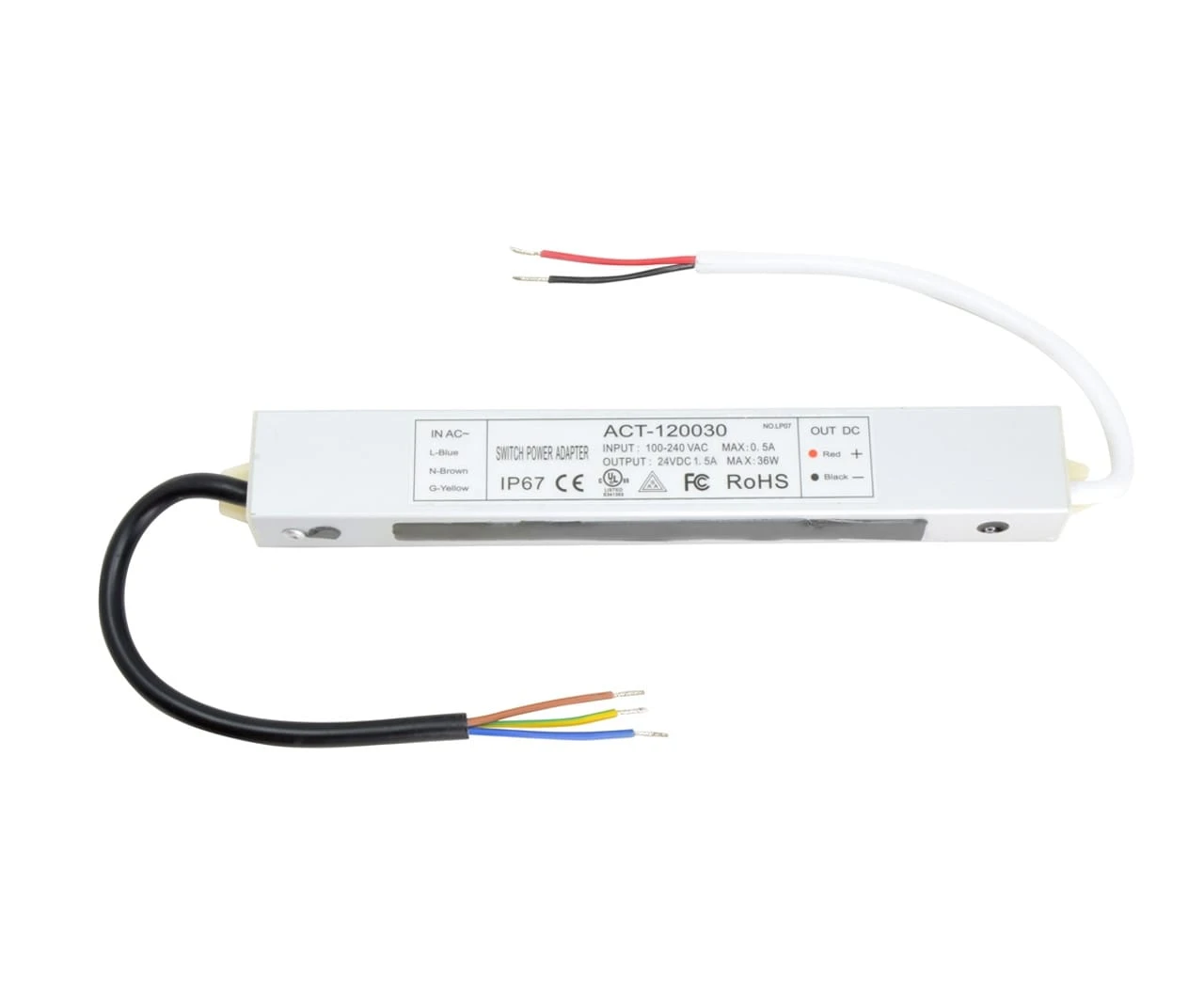 Our 24V | 36W Hardwired Value LED Driver is a high efficiency, UL-listed Waterproof LED power supply for 24V LED strips, LED bars, LED fixtures, and LED puck lights. Universal input voltage means that it accepts 120-240VAC. This LED driver needs to be “hardwired” to your local electrical code standards. This waterproof, UL-Listed LED Driver with one 24VDC output allows one to easily connect up to 36W worth of LED strip lighting in almost any type of environment without having to worry about the lifetime of the power supply.