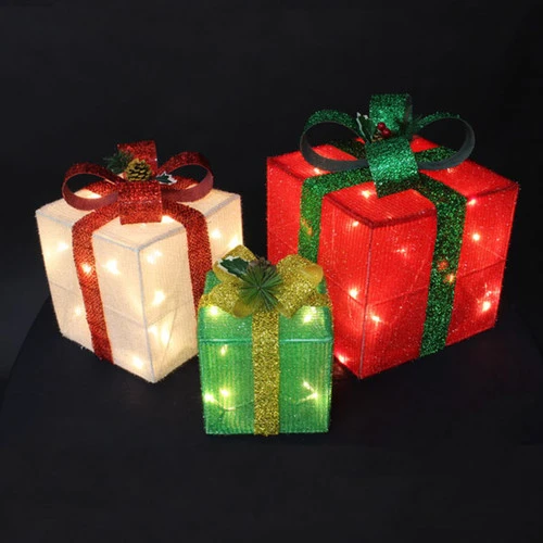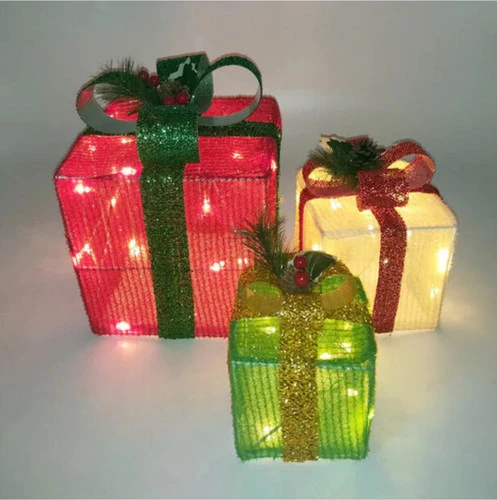 Bring out the festivities this holiday season with our set of 3 LED Gift Box Motif. The LED lights display traditional holiday colors of green, red, and white. The bows on the boxes have a beautiful shimmer with a little touch of pinecone, faux holly berries, and spring of pine. Decorate your indoor or outdoor space with these LED gift boxes. When the holidays come to an end, no need to haggle with holiday storage solutions as these will nestle inside of each other for an easy wrap up!