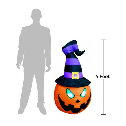 Give the neighborhood a different kind of treat with our LED Jack-O-Lantern Halloween Inflatable. This 4-foot blow-up pumpkin head comes complete with a black-and-purple witch hat and a spooky smile. LED lights on the inside illuminate your yard or an indoor haunted house. This inflatable Halloween decoration comes with a tie-down kit, fan and power adapter plus bulbs for easy setup. Add some spine-tingling charm to every October 31 with our custom lighting decorations, low prices and experienced live support.