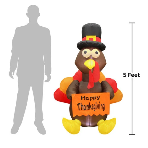Gobble gobble gobble your way to a happy, and decorative Thanksgiving. This sweet turkey welcomes all with it’s “Happy Thanksgiving” sign and festive hat. This brings us back to the first thanksgiving, celebrating friendship and prosperity. This 5-foot turkey can be featured indoors or outdoors. It is light weight and self-inflatable. Anyone in the family can set up or take down. And it has LED lights inside to light up the night at the days grow shorter. You can create a custom Thanksgiving display with our Thanksgiving decorations for unbeatable prices.
