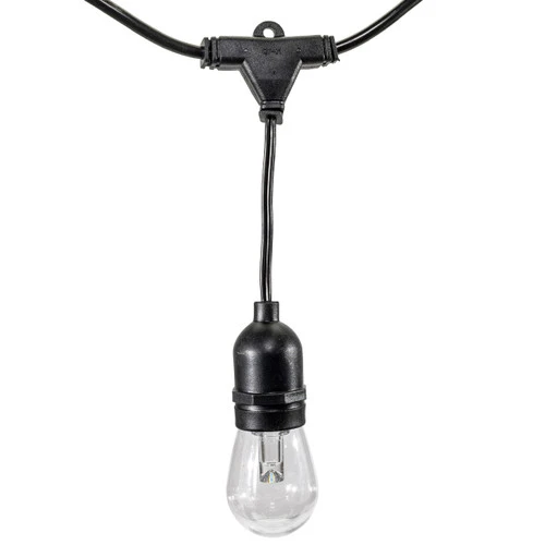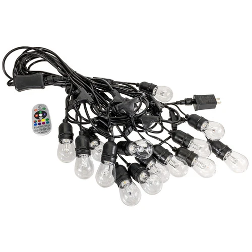 Brilliant brand bistro lights use heavy duty wire and weatherproof sockets and connections designed to be used outdoors all year long. Each set is 50 feet long with the sockets spaced every 39 inches and a 5-inch bulb drop. RGB Controller and RF remote control are included.