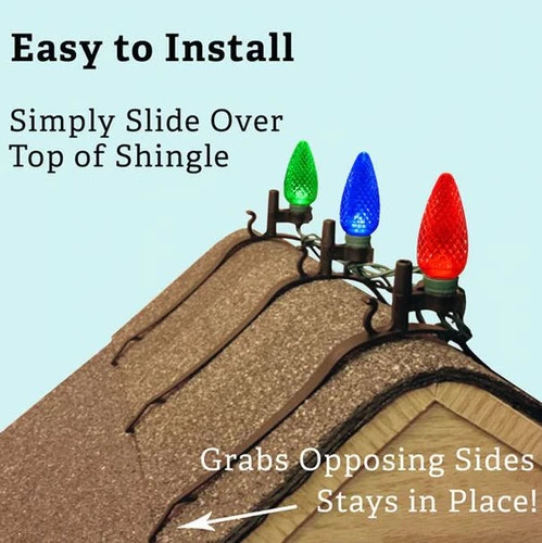 Have you always wanted to light up the ridge line of your roof but have had no way of keeping your lights strung out across it? Well the Roof Top Ridge Line Mounting Clip is the perfect solution to your problem! Just latch the plastic hooks over each side of the shingle and it will stay in place. The Roof Top Ridge Line Mounting clip is compatible with C7, C9, PixiBulbs, and Rope light, making it versatile for many different applications. There is no peeling or damage to your roof and you will be amazed at the simplicity of installation. Try the Roof Top Ridge Line Mounting Clips to complete your light display this holiday season!