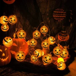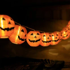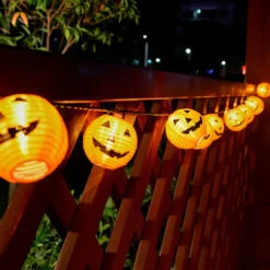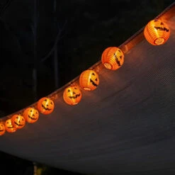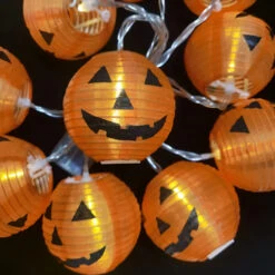 The Halloween Globe Lantern Style Pumpkin LED String Lights are a delightful and captivating addition to any spooky celebration. With 20 warm and inviting LEDs, each encased within a fun jack-o’-lantern theme globe, these lights exude an enchanting aura that perfectly embodies the spirit of Halloween. Powered by batteries, they offer the flexibility to be placed anywhere, indoors or outdoors, without needing a nearby power source. The soft glow emitted by these lights creates a festive atmosphere. Whether adorning a mantel, draping over a porch railing, or winding through a haunted garden, these lights are sure to evoke a sense of whimsy and mystery, setting the stage for a memorable Halloween experience. These string lights feature the “paper” lantern-style light but are made with a durable nylon-type material that is good for use indoors or outdoors. They are collapsible for convenience when it is time to store them away.