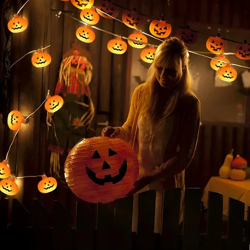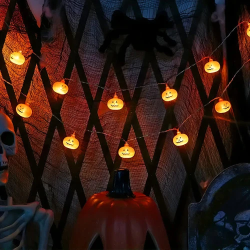The mini plastic pumpkin LED string light set is a charming and versatile decorative accessory, perfect for adding a touch to any space. Each string features 20 small, intricately crafted plastic pumpkins that emit an inviting glow. Powered by batteries, these lights offer the flexibility to be placed virtually anywhere, making them a convenient choice for both indoor and outdoor decor. Whether hung along a mantel, draped around a centerpiece, or strung along a porch railing, these delightful lights bring a festive and cozy atmosphere to your home, making them an ideal addition to your fall and Halloween decorations.