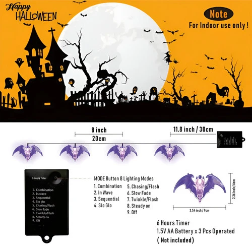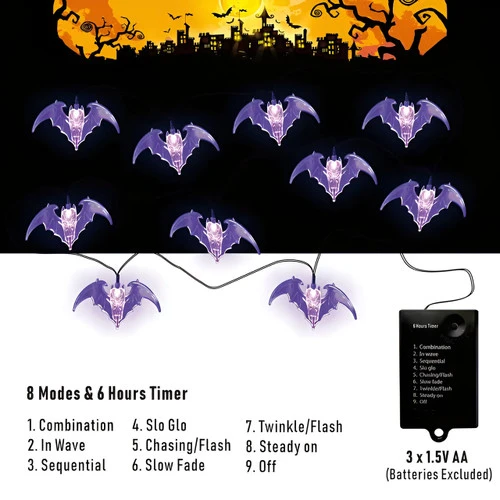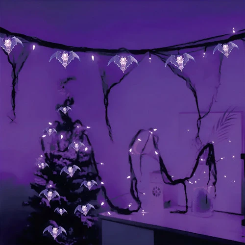 Halloween spirit, these Purple Bat String Lights are sure to cast a spellbinding spell on all who behold them. These unique 3D bat-shaped lights are crafted with durable plastic and are purple in color while also featuring a purple LED on a black string. This string has 20 bats and LEDs and is battery-operated making it easy to decorate wherever you want to add a little Halloween fun. With 8 different lighting functions, you can choose from many different patterns or just select the steady-on function, and lights automatically shut off after 6 hours.