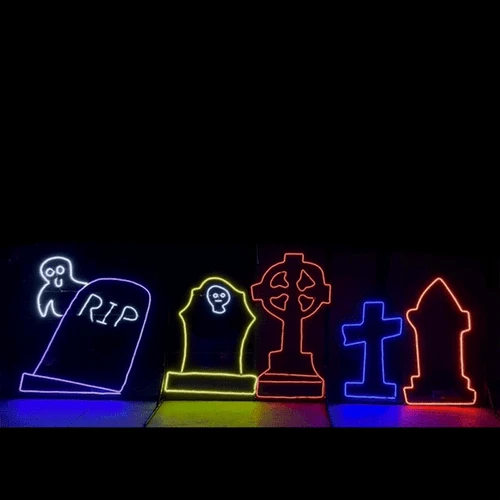 Introducing our mesmerizing LED Lighting Halloween Motif: “Ghostly Flight Over Cemetery.” This eerie and captivating display combines the modern brilliance of LED technology with the nostalgic charm of neon rope lights, bringing your Halloween decor to life like never before. In this hauntingly beautiful motif, a ghost takes flight over a cemetery, casting an ethereal glow that captures the essence of the spooky season. The LED Lighting Halloween Motif is designed to create a bewitching ambiance, whether it’s displayed in your front yard or gracing a haunted house attraction. The energy-efficient LED lights ensure that this captivating scene can be enjoyed night after night, all throughout the Halloween season, without worrying about excessive energy consumption. This motif promises to be a spellbinding addition to your Halloween decor that will leave a lasting impression on all who behold it.