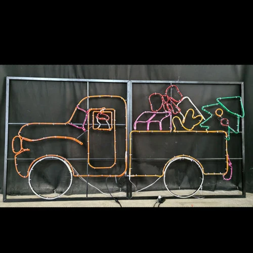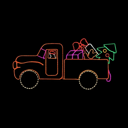 Haul in the Christmas spirit this year with our 8 foot LED Animated Santa’s Truck with Presents! The wheels on this motif rotate with the included controller, so it looks like Santa is driving presents to your house. Mount with vertical support stakes (included), plug into a 110/120 volt power outlet, and enjoy your lights! Compatible for use both indoors and outdoors.