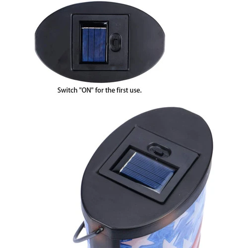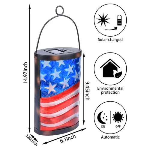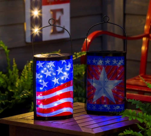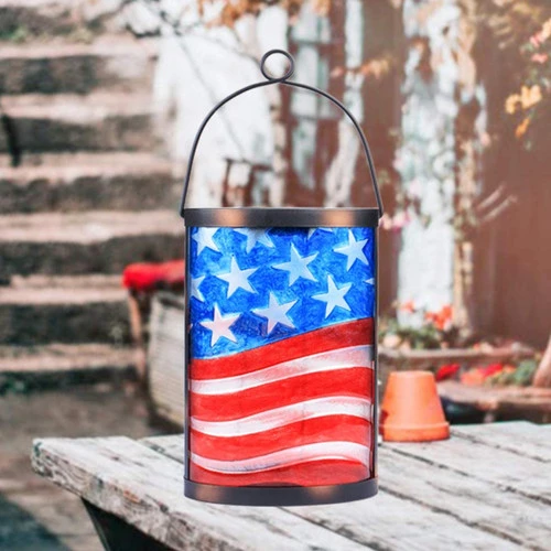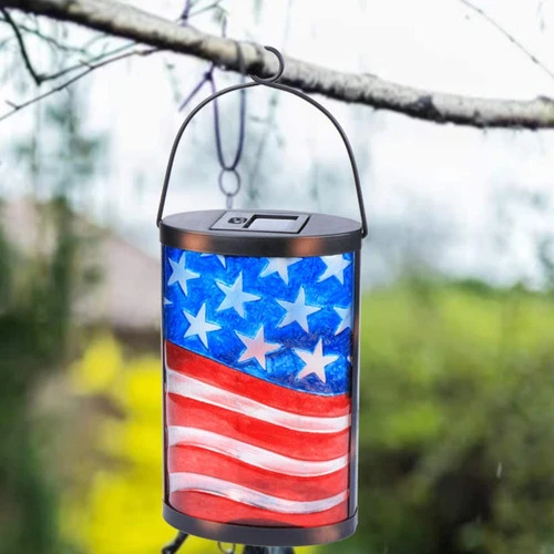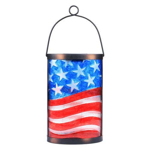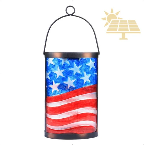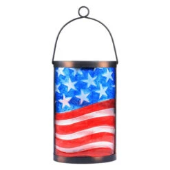 Looking for a little patriotic decoration for your garden or outdoor space? This USA Flag solar lantern makes the perfect accent piece. They look great on a patio table, or a windowsill, or set them on your porch steps to light the way. These lanterns also have a carrying handle with a built-in loop so you can hang them up as well. They feature a dusk-to-dawn sensor so they can automatically light up once it starts to get dark. Colorful glass panels held in a sturdy outdoor frame allow the lights to shine through at night and provide nice accent lighting.